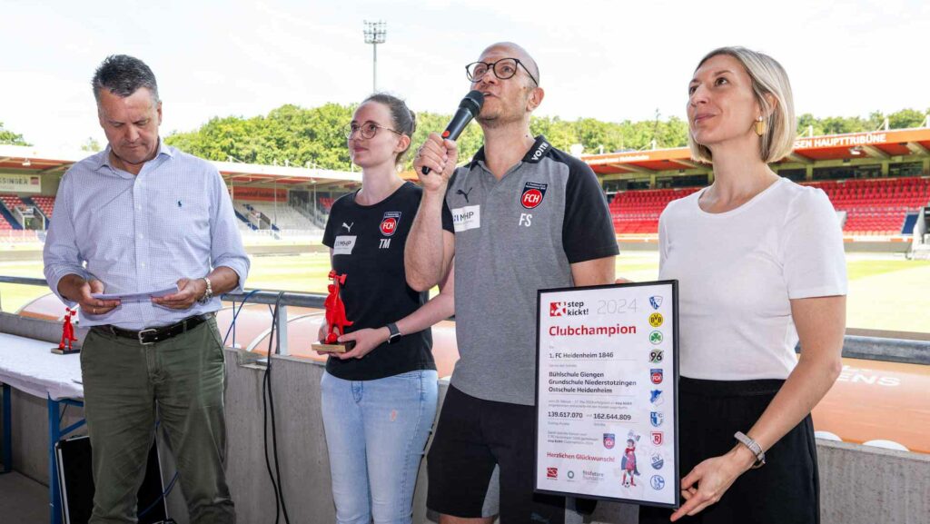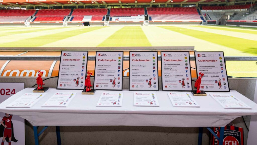 Mit 36.216.496 Schritten haben die „3b Flitzkids“ der Bühlschule Giengen den diesjährigen Schritte-Wettbewerb gewonnen und dürfen sich ab sofort step kickt!-Meister 2024 nennen. Gemeinsam mit 8 weiteren Klassen der Bühlschule Giengen, der Ostschule Heidenheim und der Grundschule Niederstotzingen machten die Schülerinnen und Schüler ihren Club, den 1. FC Heidenheim 1846, zum diesjährigen step kickt!-Clubchampion. Bei der Siegerehrung am 19. Juli in der Voith-Arena in Heidenheim wurden den Gewinnerklassen Urkunden und Pokale überreicht. Der Überraschungsbesuch des Heidenheimer Maskottchens „Paule“ war ein Highlight für die Kinder und rundete den gelungenen Tag ab.