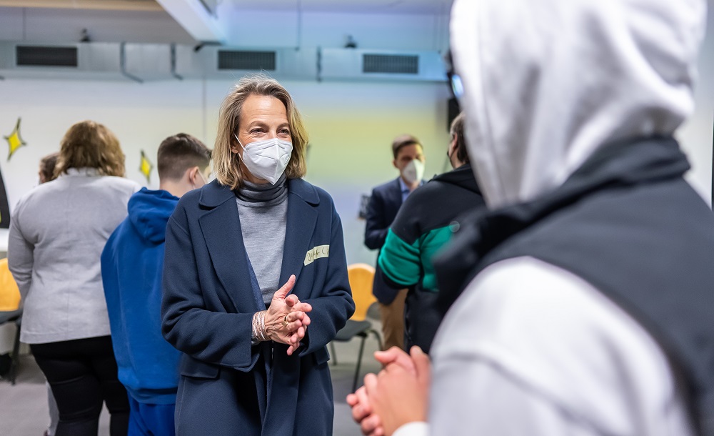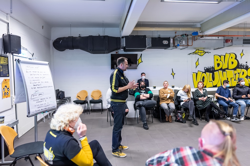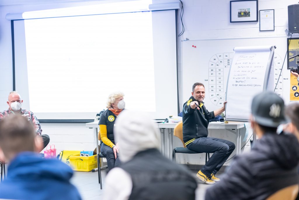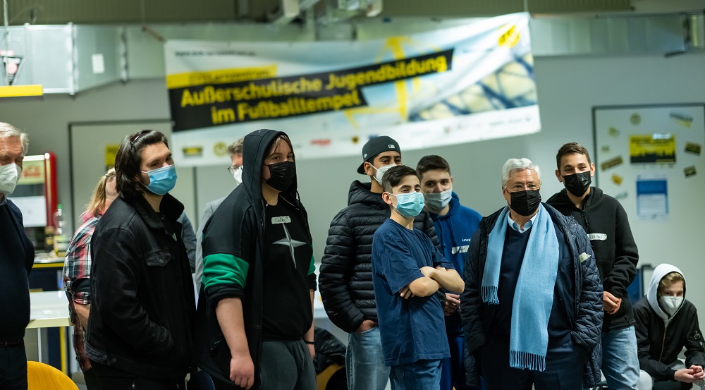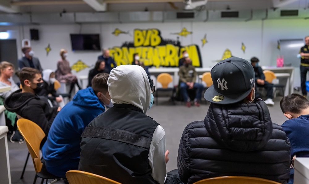 Bei dem Besuch des BVB-Lernzentrums in Dortmund, tauschten sich die Kuratoriumsmitglieder der DFL Stiftung mit den Jugendlichen aus. © Witters / DFL Stiftung