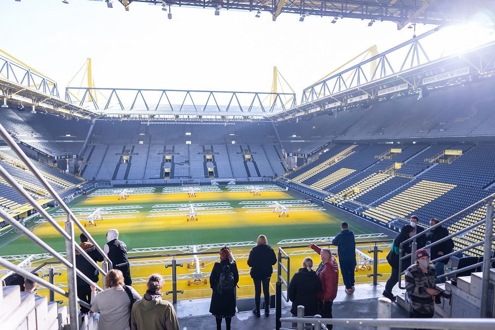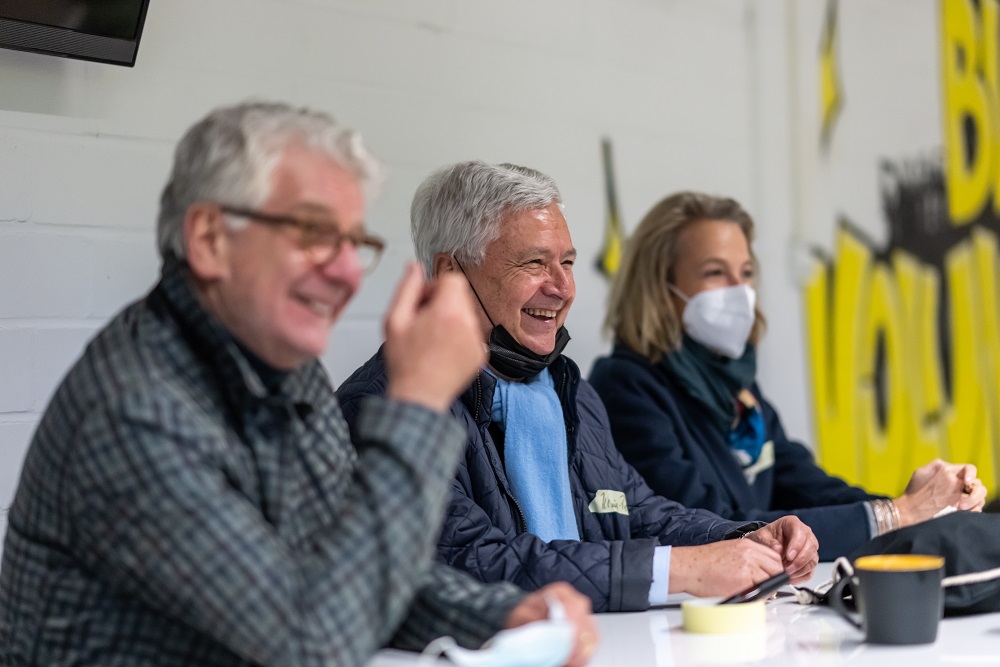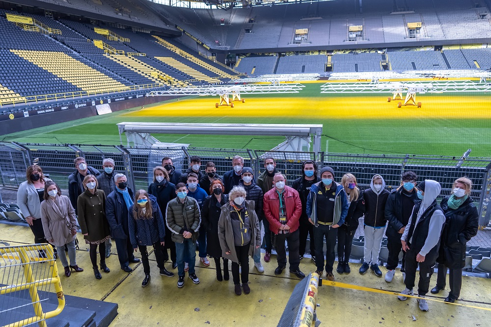 Austausch und Diskussion standen auch im Vordergrund des Besuchs von Marcel Reif (Vorsitzender des Kuratoriums), Klaus-Peter Müller (stellv. Vorsitzender des Kuratoriums), Julia Jäkel (Kuratorin) und Christian Wulff (Kurator) im BVB-Lernzentrum in Dortmund. Das Lernzentrum befindet sich im SIGNAL IDUNA PARK direkt unter der legendären Südtribüne. Hier bieten Johannes Böing, Leiter des BVB-Lernzentrums, und sein Team verschiedene Workshops zu Themen wie Zivilcourage, Rassismus und Rechtsextremismus oder Diskriminierung für Jugendgruppen an.