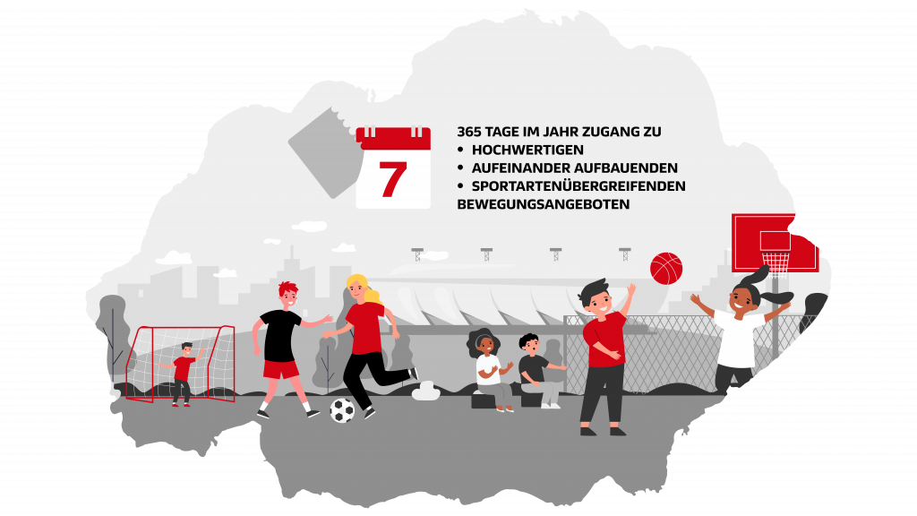 Ziel des Programms ist es, Kindern und Jugendlichen 365 Tage im Jahr einen niedrigschwelligen Zugang zu hochwertigen, sportartenübergreifenden und aufeinander aufbauenden Bewegungsangeboten in ihrer Nähe zu ermöglichen. So tun sie mit viel Spaß etwas für ihre Gesundheit und Zukunft.