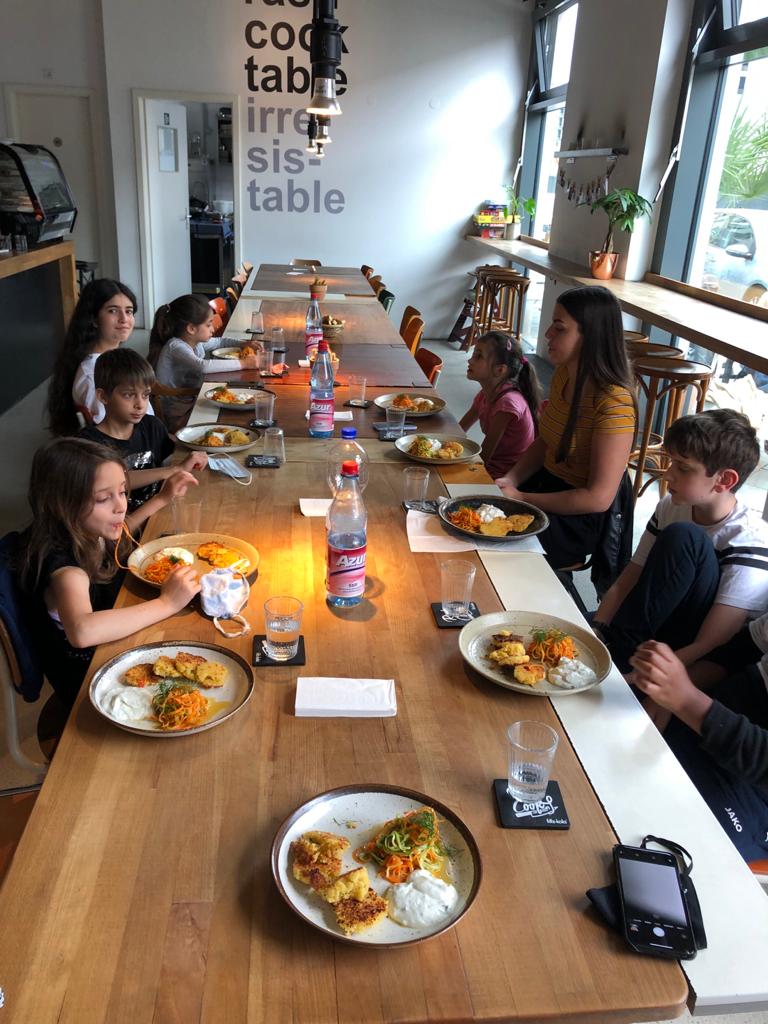 Drei Männer und und sechs Jungen sitzen am Esstisch und essen Das Ferienprogramm des Projekts „Meine Stadt. Mein Sport. Meine Zukunft.“ bietet Kindern neben den sportlichen Aktivitäten auch Einblicke in die gesunde Ernährung.