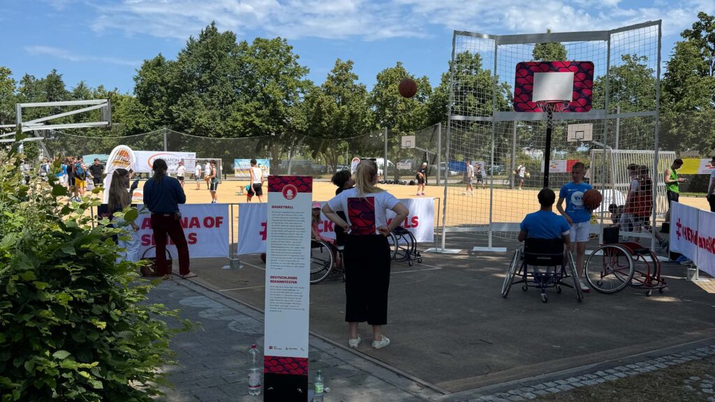 Zusätzlich habe ich bei den Para-Sport-Aktionen mitgeholfen. Es gab Blindenfußball mit Augenbinden, Fußball mit Gehhilfen (für Menschen mit Beinamputationen) und auch Rollstuhlbasketball. Diese Sportarten gemeinsam mit den Besucherinnen und Besuchern auszuprobieren war spannend und auch eine wichtige Erfahrung – für alle Beteiligten. Es war schön zu sehen, wie offen und neugierig viele Leute waren.