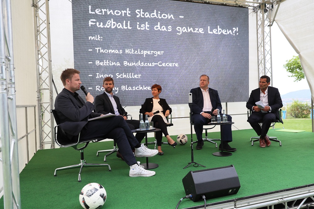 Nach der feierlichen Übergabe stellen sich unter anderem Thomas Hitzlsperger, ehemaliger Bundesliga- und Nationalspieler und Ingo Schiller, Geschäftsführer Hertha BSC, der Frage über die gesellschaftliche Verantwortung des Profifußballs.