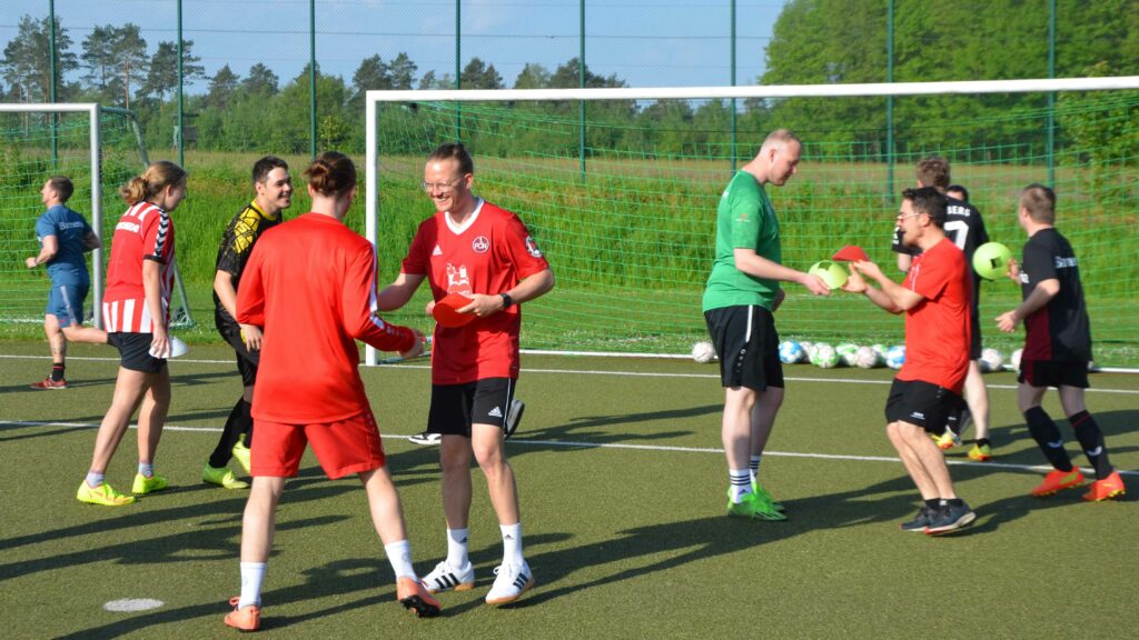 Das abwechslungsreiche Programm umfasste sowohl theoretische als auch praktische Einheiten rund um Methodik und Didaktik im Behinderten- und Inklusionsfußball. Während die Young Coaches und Tandempartner*innen in den ersten Tagen dabei noch viel Anleitung von dem Instruktor*innen-Team erhielten, waren sie im Laufe der Woche immer mehr selbst gefragt. Zunächst erprobten die Tandems selbst vorbereitete Trainingsübungen untereinander, bevor sie dann am Wochenende zwei Trainingseinheiten für die Inklusionsteams von FC Germania Zündorf, FC Hertha Bonn, FC Rheinsüd Köln und SV Grün Weiß Brauweiler 1961 durchführten. Die Begeisterung der Kinder und Jugendlichen war letztendlich die schönste Bestätigung für den Erfolg und die Entwicklung der Tandems in dieser Woche. Nach einem letzten Feedback vom Ausbildungsteam erhielten somit alle 12 Tandems ihr wohlverdientes Zertifikat und kehren nun in ihre eigenen Behinderten- und Inklusionsmannschaften zurück, um dort das Gelernte direkt anzuwenden.