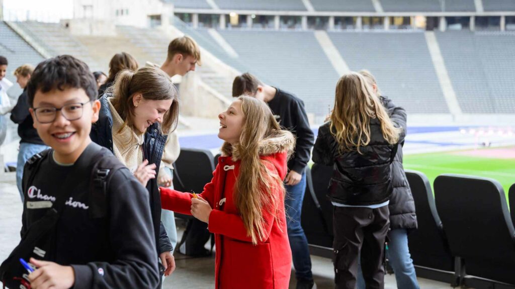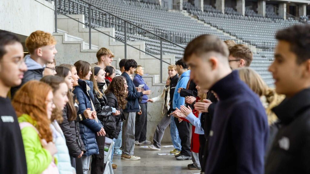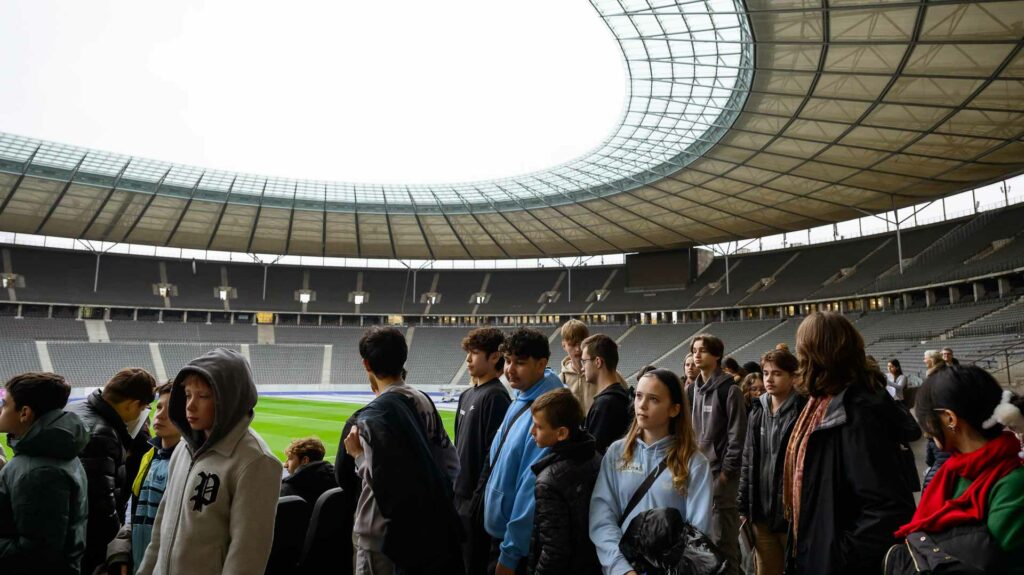 Am 7. November trafen sich Schüler*innen des Leibniz-Gymnasiums Potsdam-Babelsberg mit Koordinator*innen von Lernort Stadion und Expert*innen der politischen Bildung im Olympiastadion Berlin zu einem gemeinsamen Austausch. In der Jesse-Owens-Lounge erwartete die Teilnehmenden ein abwechslungsreiches Programm und die Möglichkeit zu vielfältigen Diskursen.