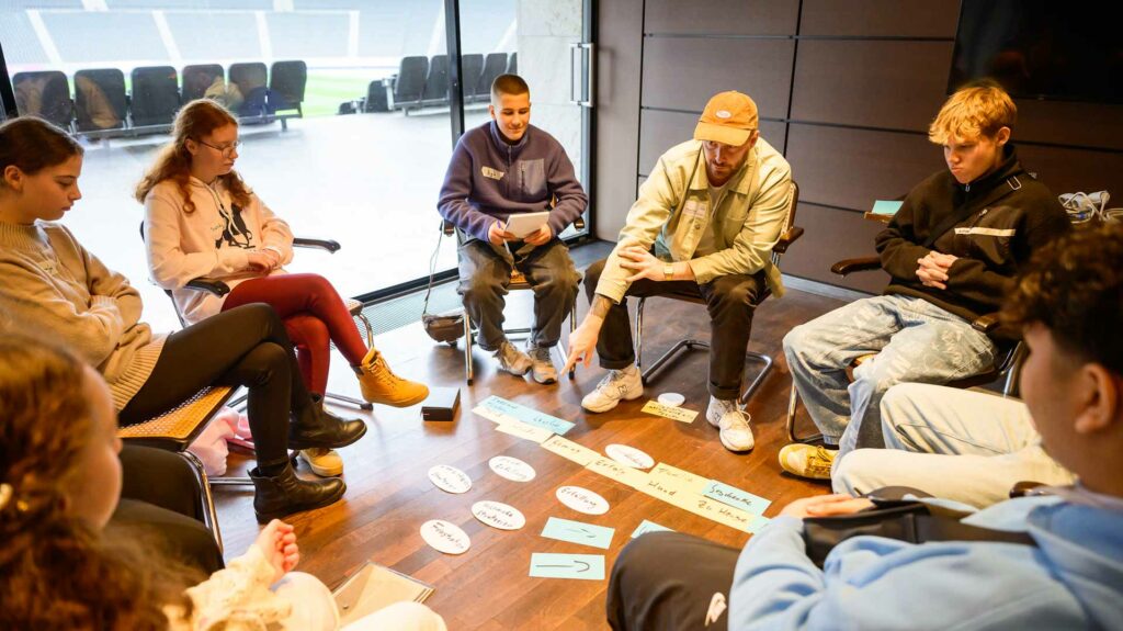 Jugendliche des Leibniz-Gymnasiums Potsdam-Babelsberg diskutieren im „Diskursraum D“ mit Expert*innen der politischen BIldung. Fotos: Franz Josef/ Lernort Stadion e.V.
