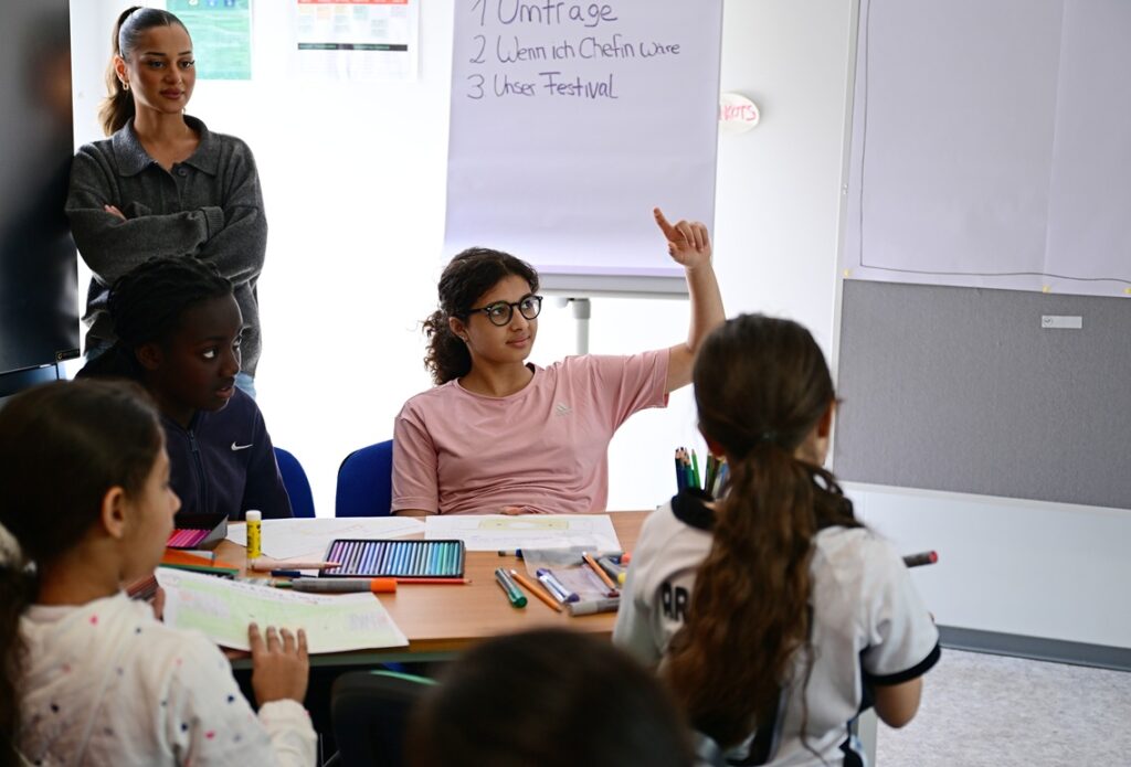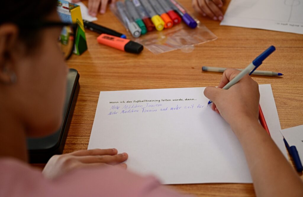 Nach der künstlerischen Phase beginnt auch schon die Diskussion. Wie würdet ihr das große Sommerfest vom Safe-Hub organisieren, wenn ihr hier das Sagen hättet? Maya regt ein großes Mädchenfußballturnier an, Swetlana plädiert für Boxen und Yoga, Aylin will die Familien aller Mädchen zu Popcorn einladen, oder zu anderen Snacks. Und Zuckerwatte! Und die Musik aus der großen Box darf natürlich auch nicht fehlen. Julia Knopf notiert alle Wünsche und verspricht, sie der Geschäftsführerin des Safe-Hub vorzulegen: „Das sind tolle Vorschläge! Ihr könnt euch sicher sein, dass wir uns darum kümmern!“ Es geht nicht nur um Konsultation, sondern um ganz konkrete Mitbestimmung. Die Mädchen sollen nicht nur das Gefühl haben, dass sie mitbestimmen. Sie sollen tatsächlich Entscheidungen treffen. „Die Diskussion zur Planung des Sommerfests ist mehr als ein netter Programmpunkt“, sagt Julia Knopf. „Die Wünsche der Mädchen sind Ausgangspunkte für unsere interne Planung.“