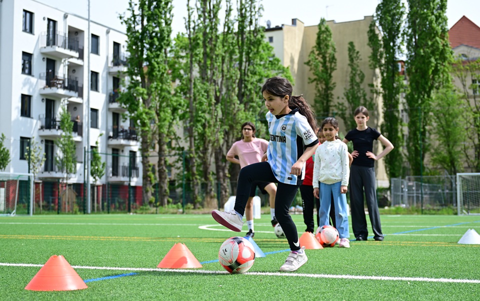 Das Girls Hub-Programm von Safe-Hub Berlin nutzt den Fußball, um das Selbstbewusstsein junger Mädchen über zu stärken. Foto: DFL Stiftung/ Witters