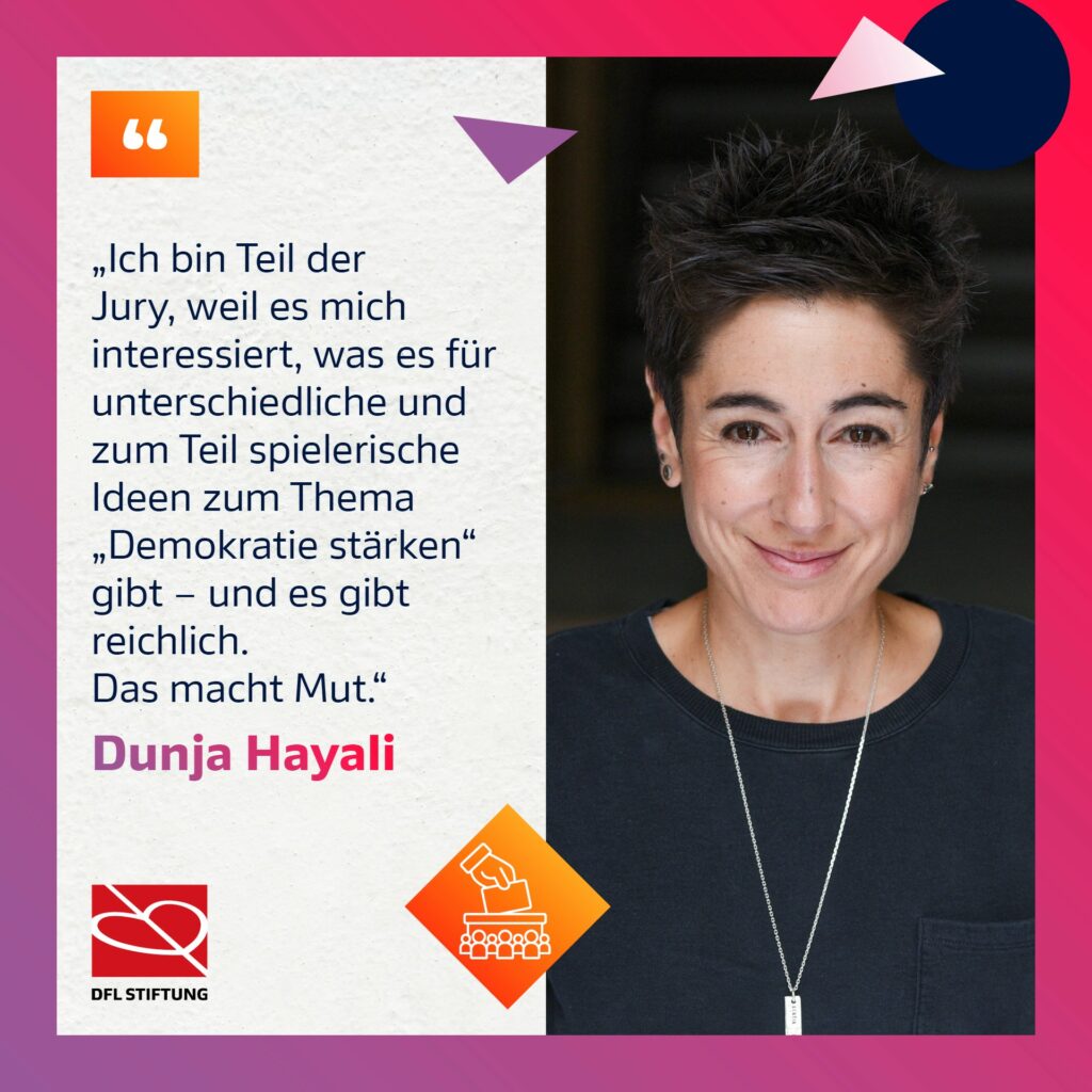 „Ich bin Teil der Jury, weil es mich interessiert, was es für unterschiedliche und zum Teil spielerische Ideen zum Thema ‚Demokratie stärken‘ gibt – und es gibt reichlich. Das macht Mut“, sagt Dunja Hayali über ihre persönliche Motivation, an der Auswahl der geförderten Projekte mitzuwirken.