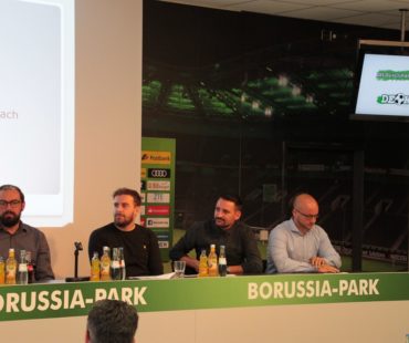 Eine Podiumsdiskussion im Borussia-Park Stadion. Vier Männer sitzen an einem Tisch mit dem Schriftzug "BORUSSIA-PARK" vor einer Wand mit Sponsorlogos und einem Bildschirm, der eine Fußballszene zeigt.