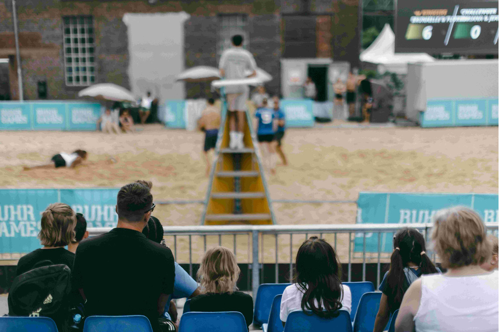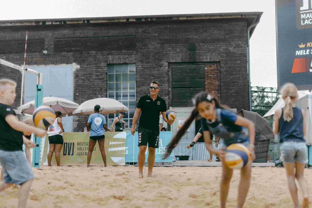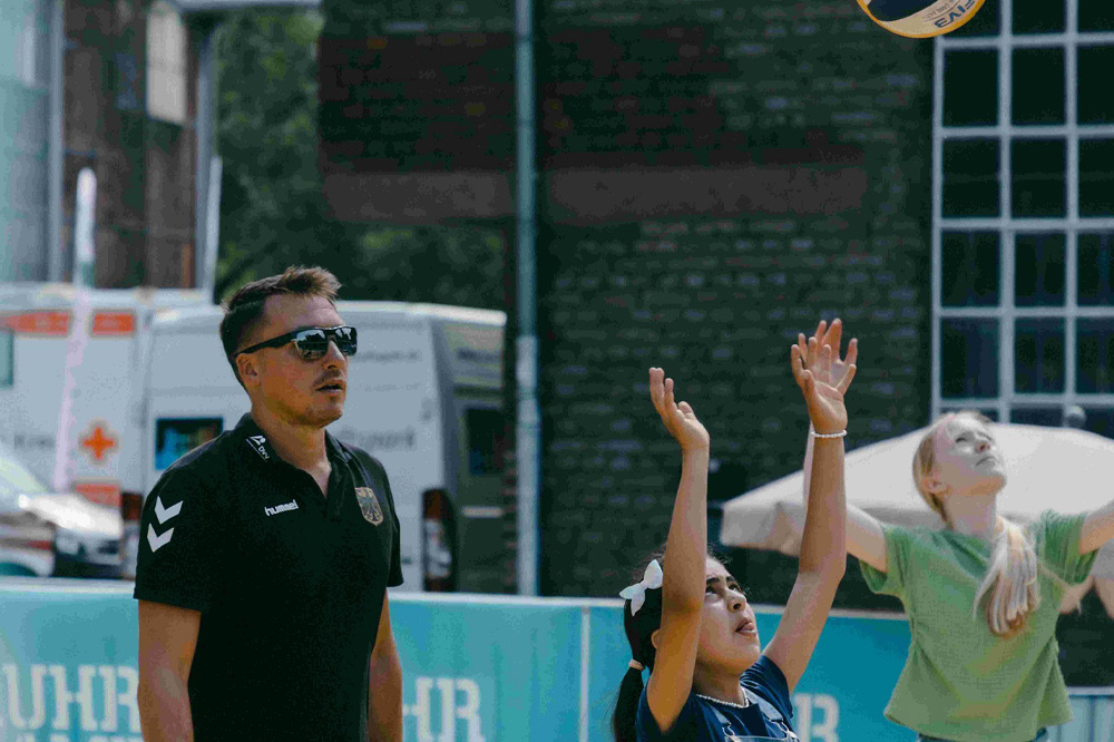 Schnuppertraining vor beeindruckender Kulisse: Nachwuchsbundestrainer Kersten Holthausen gab den Kids eine Einführung ins Beachvolleyball.