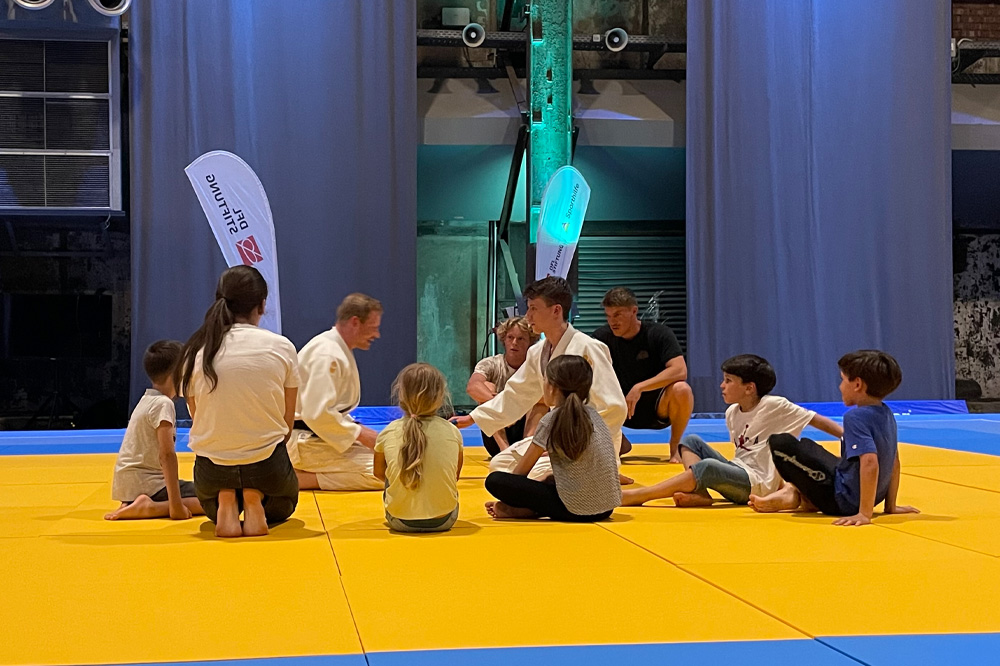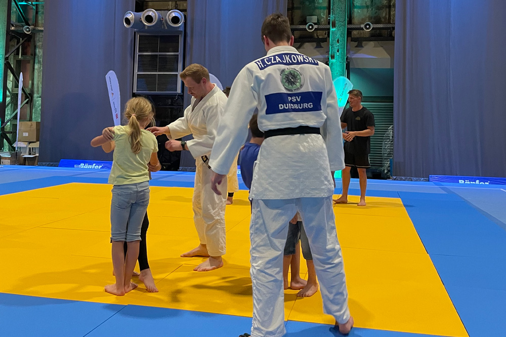 Drei Trainerinnen und Trainer vom Nordrhein-Westfälischen Judoverband zeigten den Kindern nicht nur verschiedene Fall-, Wurf- und Bodentechniken, sondern brachten ihnen auch die zehn Judowerte (Höflichkeit, Hilfsbereitschaft, Ehrlichkeit, Ernsthaftigkeit, Respekt, Bescheidenheit, Wertschätzung, Mut, Selbstbeherrschung und Freundschaft) bei. Alle Teilnehmenden gingen stolz mit dem weiß-gelben Gürtel, dem ersten Judoabzeichen, von der Matte.