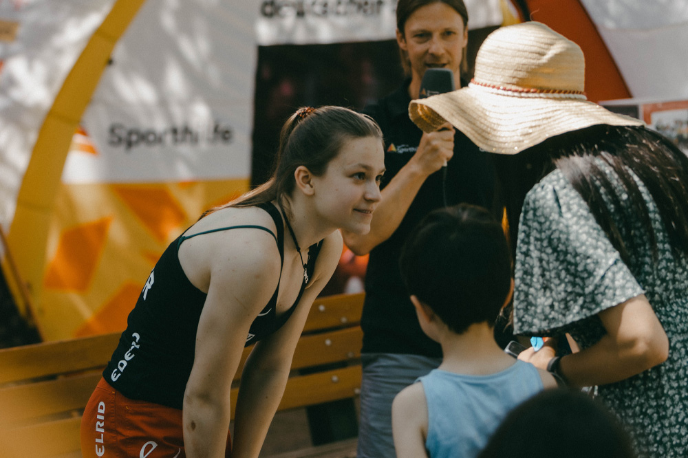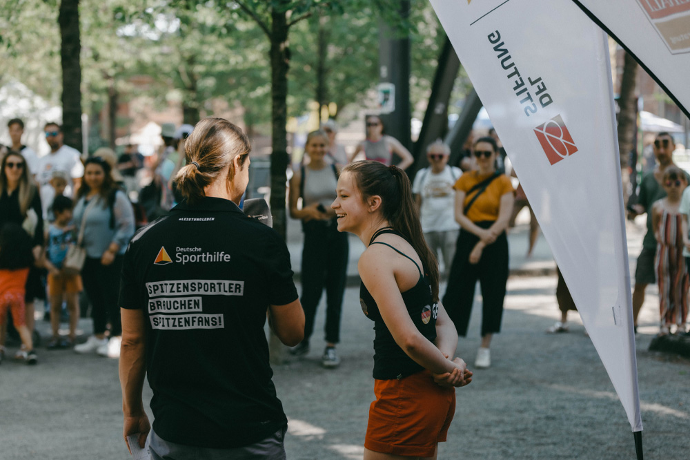 Nele Thomas, Junioren-Europameisterin im Speedklettern, Botschafterin der Ruhr Games und Gesicht der Initiative #ZukunftBewegen, erklärte im Talk mit Moderator Kai Gemeinder am Sporthilfe-Stand, worauf es beim Speedklettern ankommt, was ihre Ziele sind und begeisterte dabei viele Kids für ihre Sportart. Sie schrieb nicht nur Autogramme und machte Fotos mit ihren jungen Fans, sie ging außerdem bei den European Youth Championships an den Start, die im Rahmen der Ruhr Games einen Tag später stattfanden.