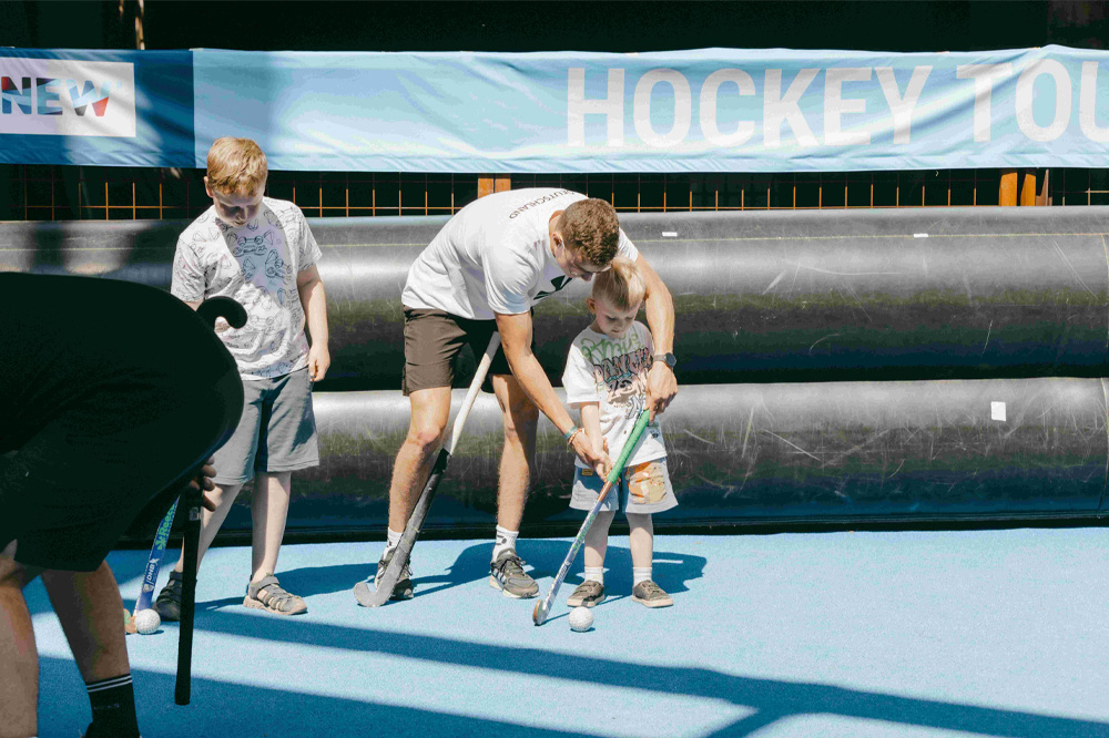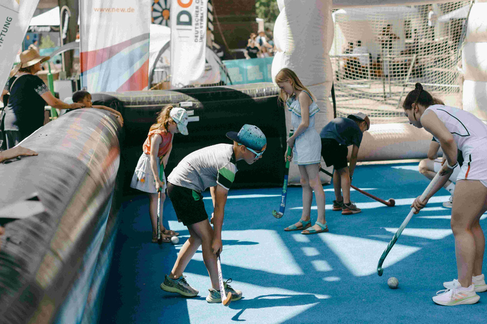 Was das Besondere am Hockey ist, wie man den Schläger richtig hält und mit welchen Tricks man den Torwart besonders gut überwinden kann, erklärten die drei Hockeytalente Antheus Barry, Marie Hahn und Luis Höchemer den Kindern mit viel Begeisterung. Die drei Junioren-Europameisterinnen und -meister nahmen sich viel Zeit für die knapp 50 Kinder und brachten ihre Begeisterung für ihren Sport rüber. Auch sie schauten bei Moderator Kai Gemeinder vorbei und beantworteten seine Fragen und die Autogrammwünsche der zuhörenden Kids.