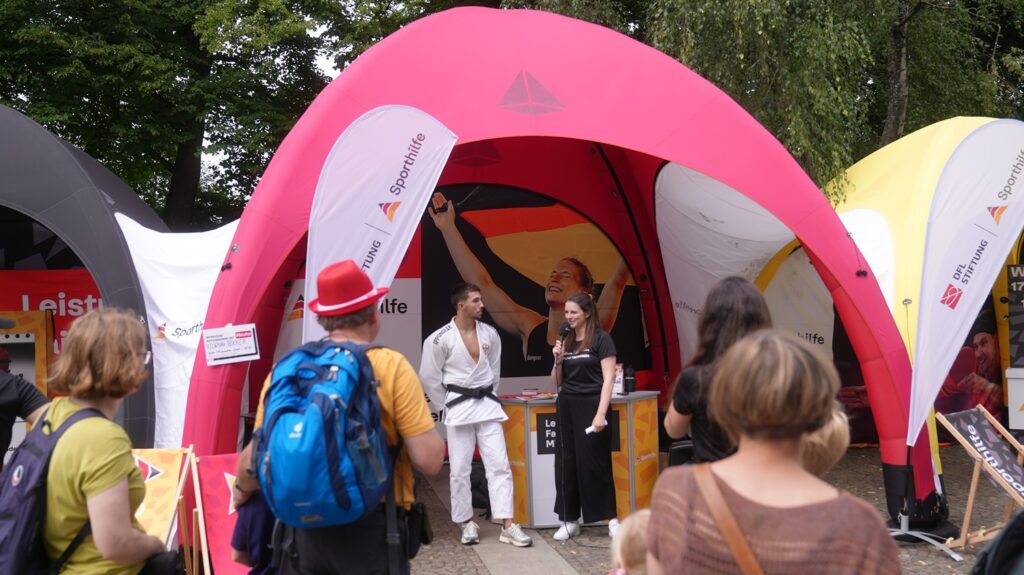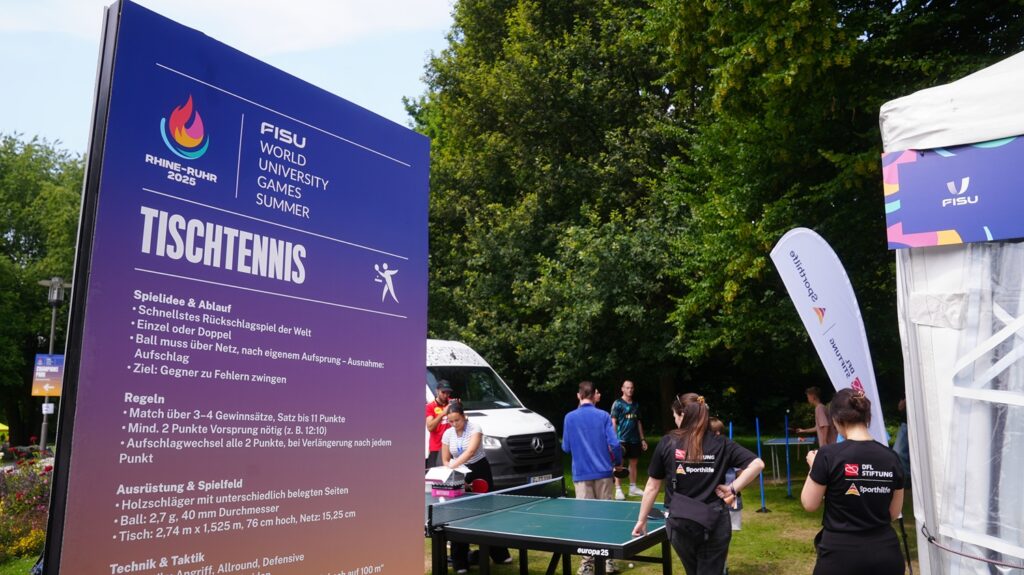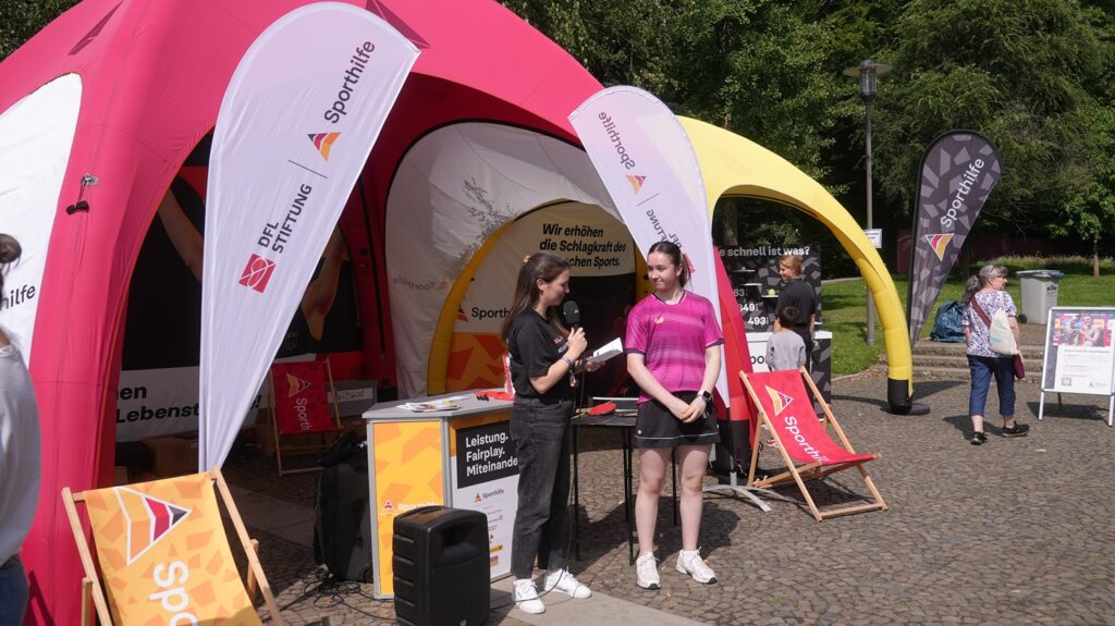 Zum Auftakt bot Tischtennis-Nachwuchshoffnung Eireen Kalaitzidou ein Schnuppertraining an. Unterstützt vom Westdeutschen Tischtennisverband stellte sie sich der Herausforderung unter freiem Himmel und zeigte Kindern und Jugendlichen spannende Techniken. Neben wertvollen Tipps auf der Platte berichtete sie im Interview am Stand der Sporthilfe über ihre Ziele, ihre Erfahrungen und die Bedeutung der Förderung im Leistungssport.