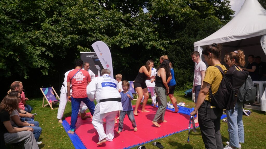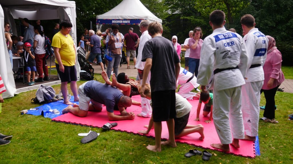 Zwei Tage später trat der Essener Nachwuchsjudoka Florian Böcker gemeinsam mit Trainerinnen und Trainern des PSV Essen auf die Matte. In mehreren Trainingseinheiten lernten die Teilnehmenden die Grundlagen des Judo – von der Begrüßung über sicheres Fallen bis hin zu ersten Wurftechniken und den zentralen Judowerten. Als Highlight konnten viele Kinder und Jugendliche sogar den weiß-gelben Gürtel erwerben – ein erster Schritt in Richtung Schwarzgurt. Im Anschluss stand auch Florian Böcker für Interviews, Fotos und Autogramme zur Verfügung.