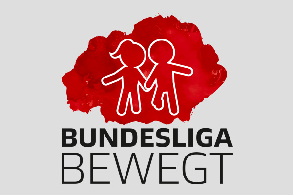 Vier junge Fußballspieler in roten Trikots sitzen auf einem grünen Rasen und betrachten gemeinsam ein Smartphone. Im Hintergrund ein Banner mit dem DFL Stiftung Logo.