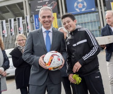 Ein Junge jongliert auf einem Fußballplatz vor der Commerzbank-Arena in Frankfurt. Im Hintergrund sind weitere Personen und Zelte zu sehen.