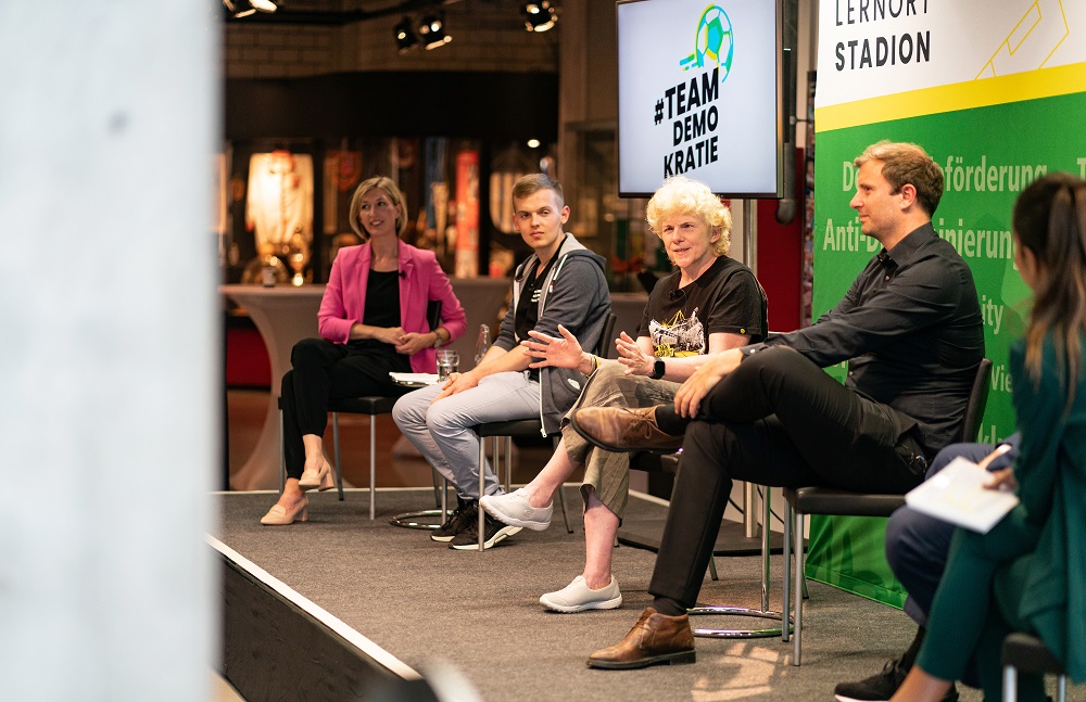 Den Auftakt von #TeamDemokratie bildete am gestrigen Abend eine Podiumsdiskussion im Eintracht Frankfurt Museum, einem von 23 Standorten von „Lernort Stadion“. Söhnke Vosgerau, Vorstandsvorsitzender vom Lernort Stadion e.V., erklärte: „Gerade im Kontext der Corona-Pandemie ist es uns wichtig, Jugendliche dazu zu ermutigen, eine eigene demokratische Haltung zu entwickeln und sich aktiv in der Gesellschaft einzubringen. Mit der Initiative #TeamDemokratie wollen wir ein Zeichen setzen und junge Menschen mit der Strahlkraft des Fußballs für demokratische Werte und Teilhabe begeistern und ihnen ein Sprachrohr für ihre Anliegen bieten.“