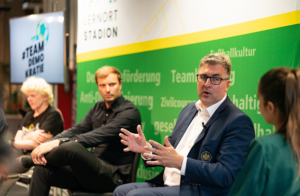 Unter der Moderation von Lea Wagner diskutierte er gemeinsam mit Axel Hellmann (Vorstandssprecher Eintracht Frankfurt), Franziska Fey (Vorstandsvorsitzende DFL Stiftung), Conny Dietz (Paralympicssiegerin & Teamerin im BVB-Lernzentrum) sowie Julien Chamboncel (stv. Vorsitzender des Frankfurter Jugendrings) darüber, wie die Jugend für Demokratie begeistert werden kann und welche Rolle der Fußball dabei spielt. „Das Fußballstadion, als Ort positiver Erlebnisse, kann Jugendlichen, die über klassische Bildungseinrichtungen nicht erreicht werden, den Zugang zu demokratischen Grundwerten ermöglichen“, so Axel Hellmann. Franziska Fey bestärkte: „Lernort Stadion bringt Fußball und politische Bildung auf geniale Art zusammen. Über den besonderen Ort, spannende Workshopinhalte, vielfältige Methoden und authentische Referentinnen und Referenten gelingt es, politische Themen greifbar zu vermitteln und die Jugendlichen dafür zu begeistern.“