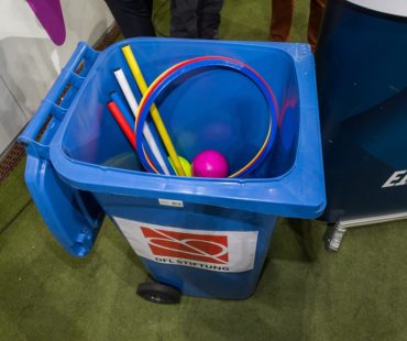 DFL Stiftung Logo auf einem Müllcontainer vor dem Stadion der TSG 1899 Hoffenheim bei einer Weihnachtsaktion. Im Hintergrund sind Personen und Sitzreihen erkennbar.