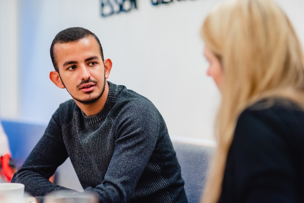 Saleh im Gespräch mit Autorin Mara Pfeiffer. ©DKJS/ Clemens Hess