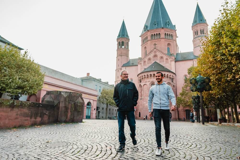 Ronald Uhlich (FC Ente Bagdad) und Saleh vor dem Mainzer Dom. ©DKJS/ Clemens Hess