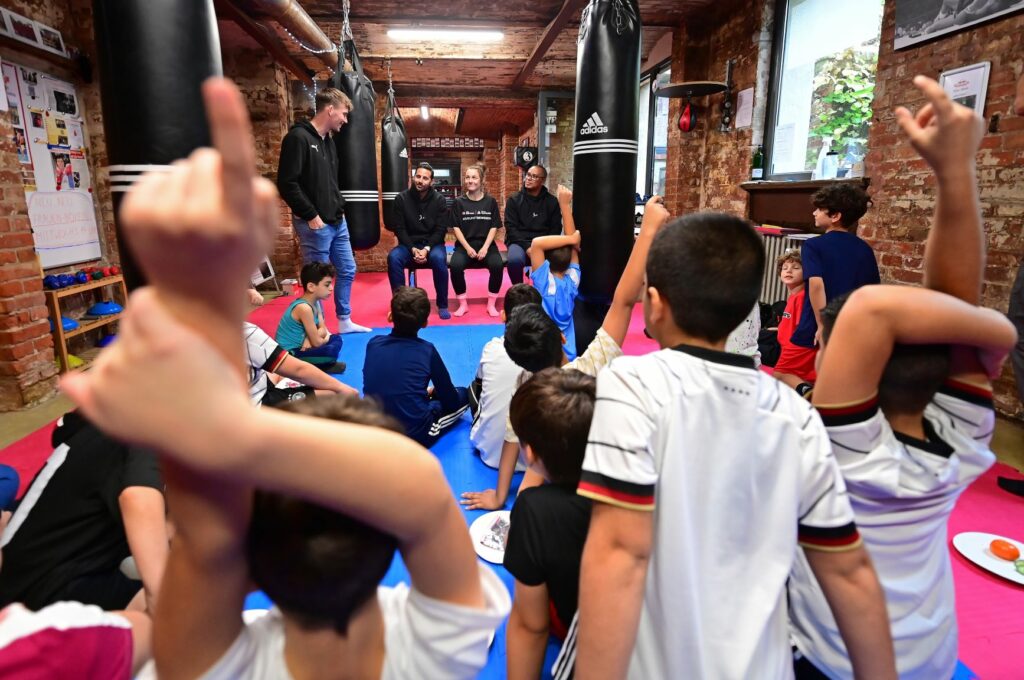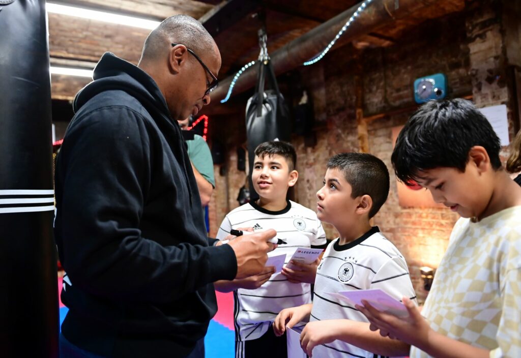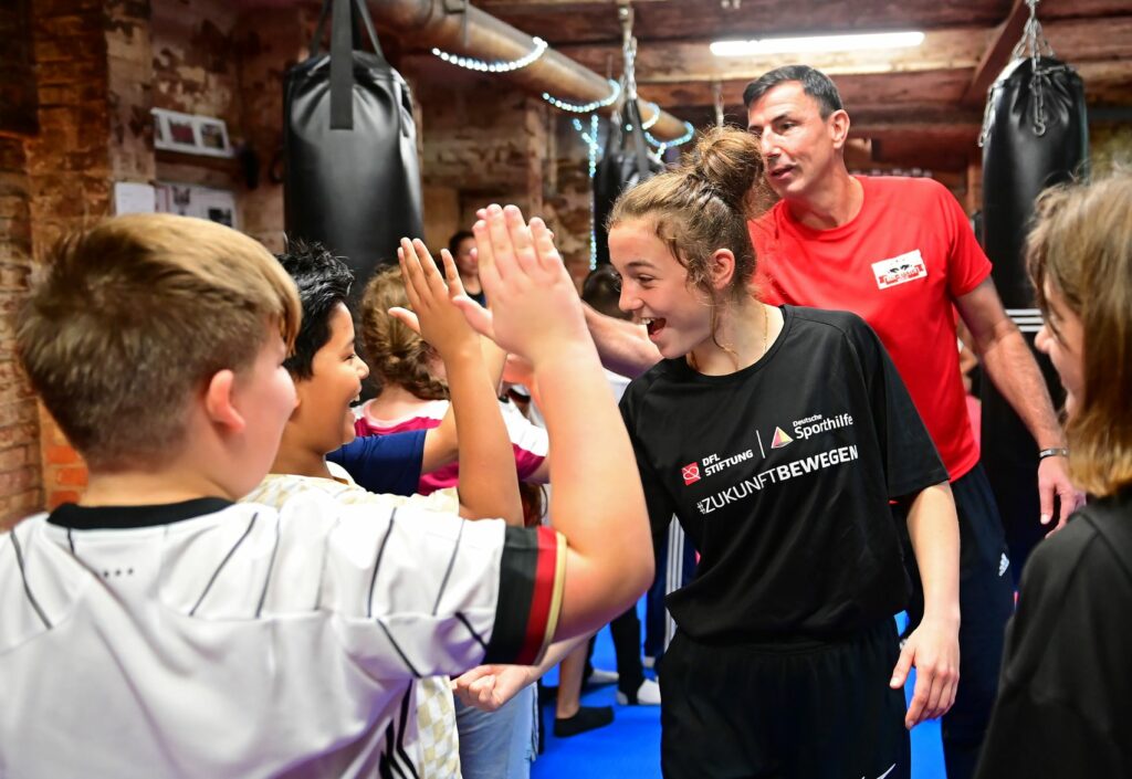 20 Kinder haben in Berlin an einem boxspezifischen Bewegungsprogramm mit #ZukunftBewegen-Protagonistin Lena Büchner teilgenommen, das gemeinsam von der DFL Stiftung und der Deutschen Sporthilfe organisiert wurde. Im Anschluss hatten die Kinder die Möglichkeit, ihr und den Bundesliga-Legenden Claudio Pizarro und Paulo Sérgio Fragen zu stellen.